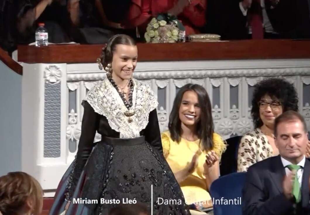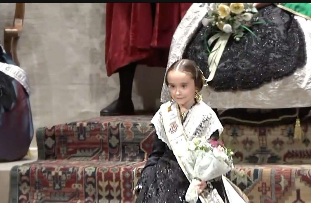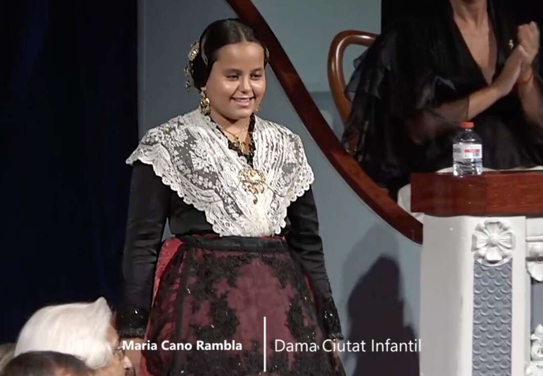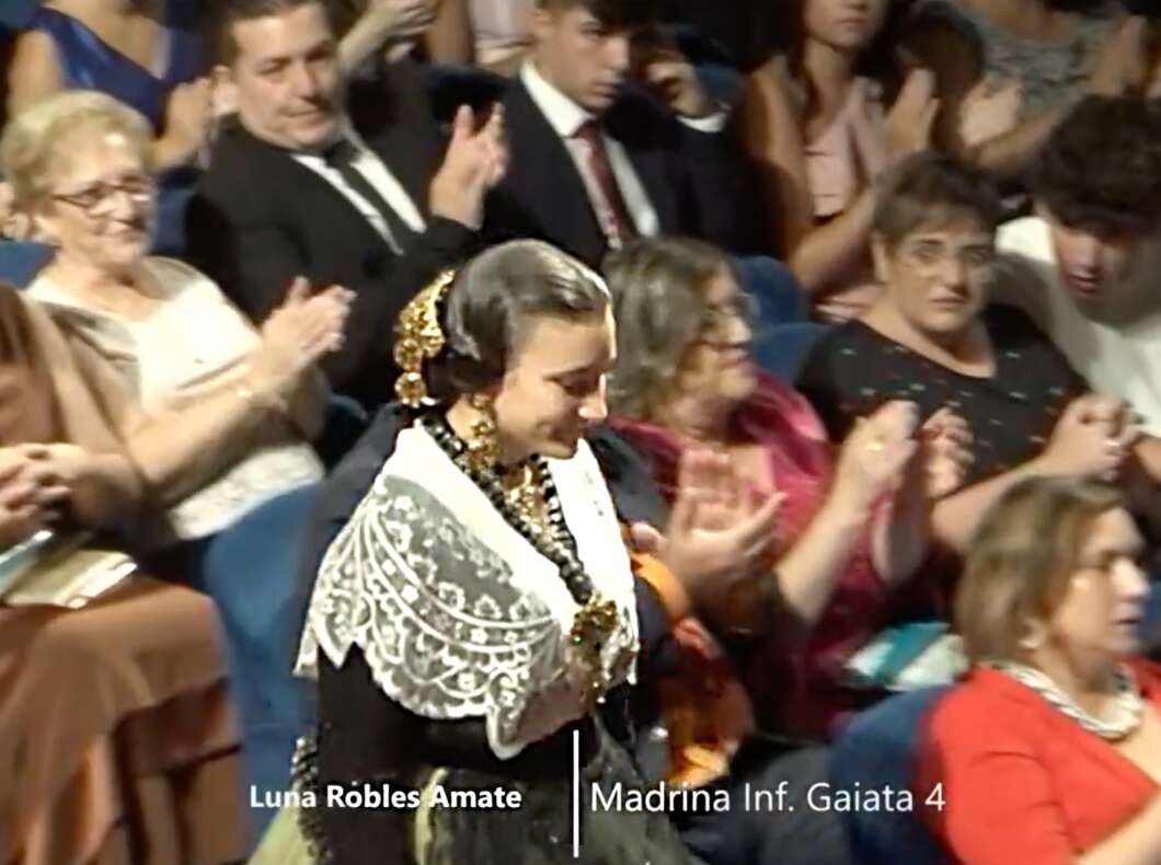 La protagonista de la noche, Alejandra Sáez, subió al escenario con una gran sonrisa y nervios, precedida por los presidentes infantiles seguidos por la policía de gala y los maceros. En el escenario, Marc Osorio Cazorla colocó el cojín distintivo de reina a Alejandra. Fue un momento muy bonito, porque el niño intentó hacerlo con todo el cariño, pero cuando ya bajaba los escalones, volvió a subir para recolocar la falda de su reina.