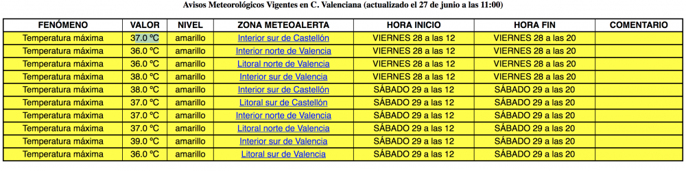 Aquest avís s'estén també a aquelles àrees de vegetació que, encara que no tinguen la consideració de terreny forestal, siguen susceptibles de cremar. L'avís també estableix que s'han de limitar al màxim totes les activitats que suposen un risc d'incendi en els espais vulnerables al foc mentre dure l'onada de calor.