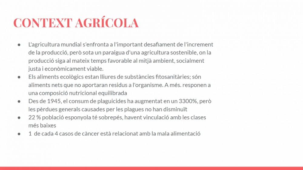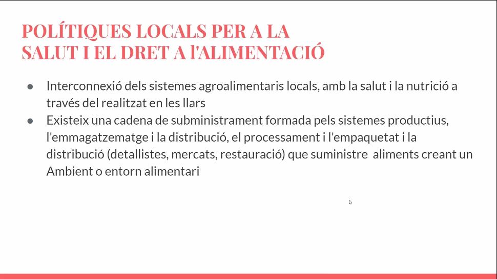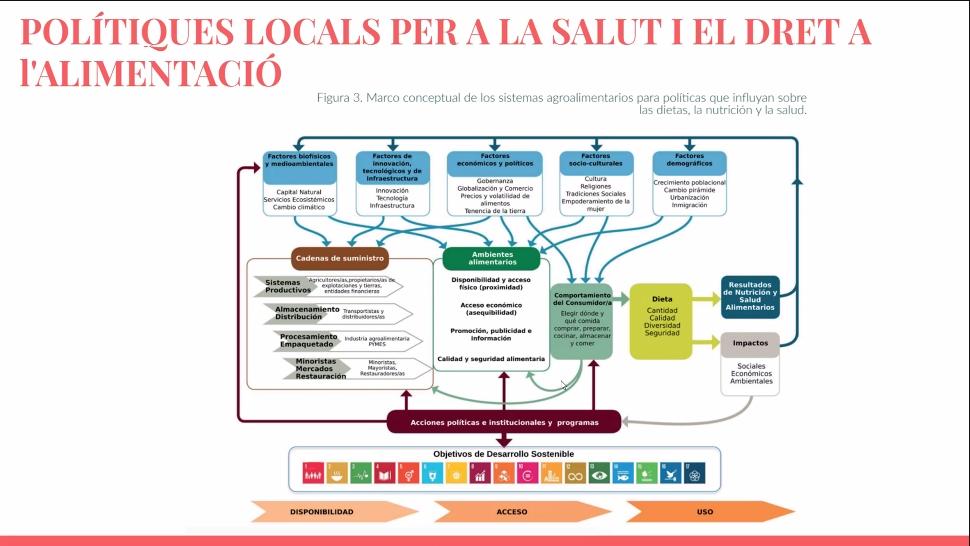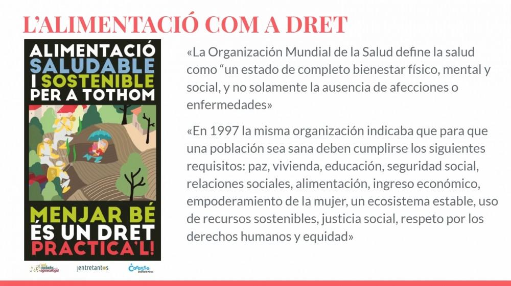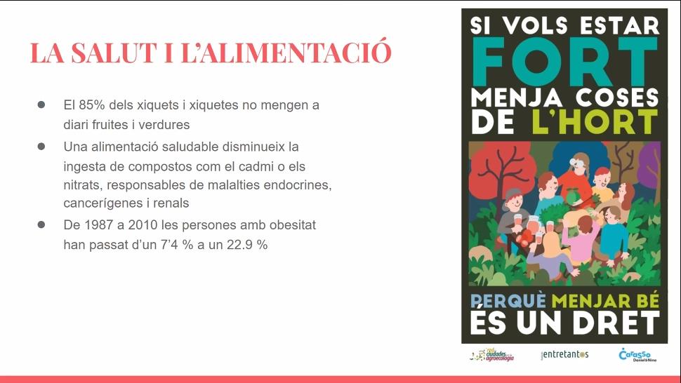 Ha continuat que l'alimentació saludable és “un dret” segons l'Organització Mundial de la Salut i que actualment s'afronta un context en què està canviant el paradigma de l'agricultura davant els reptes per l'increment de població, el canvi climàtic i l'afecció en la salut dels productes fitosanitaris. Segons ha exposat d'acord un informe de la Xarxa de Ciutats de l'Agroecologia, un de cada quatre casos de càncer estan vinculats amb una mala alimentació; mentre l'obesitat ha crescut a Espanya de 1987 a 2010 d'un 7% al 22%.