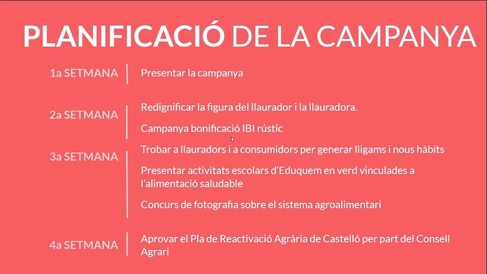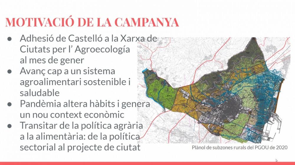 “Alimentació és Salut va ser promoguda per la Xarxa de Ciutats d'Agroecologia durant la pandèmia i ara se suma l'Ajuntament de Castelló per a caminar cap a un model agroalimentari més sostenible i repensar l'economia tenint en compte el sector agroalimentari en la recuperació”, ha explicat el regidor de Transició Ecològica, Fernando Navarro. A la iniciativa també s'han adherit ajuntaments com els de València, Saragossa, Valladolid o Còrdova. Transició Ecològica ha inclòs també les propostes que treballa en el si la Comissió de Reactivació Agrària del Consell Agrari Municipal.