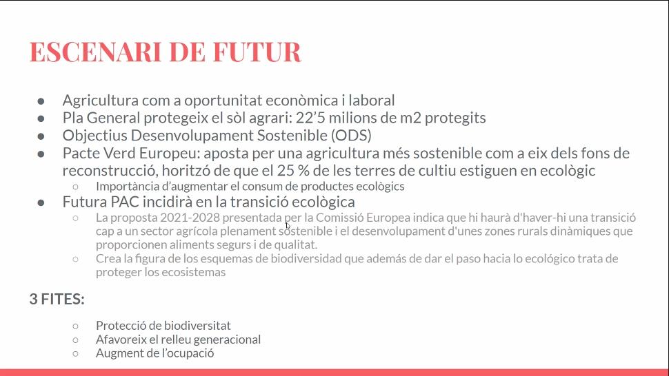 El regidor municipal ha subratllat que l'agroalimentació sostenible i la conservació del territori són eixos estratègics dels fons de reconstrucció, de la nova Política Agrària Comú de la Unió Europea i dels Objectius de Desenvolupament Sostenibles de l'Organització Mundial de l'ONU, amb el que a més de millorar el benestar ciutadà, es presenten com una “oportunitat” per a la recuperació econòmica.