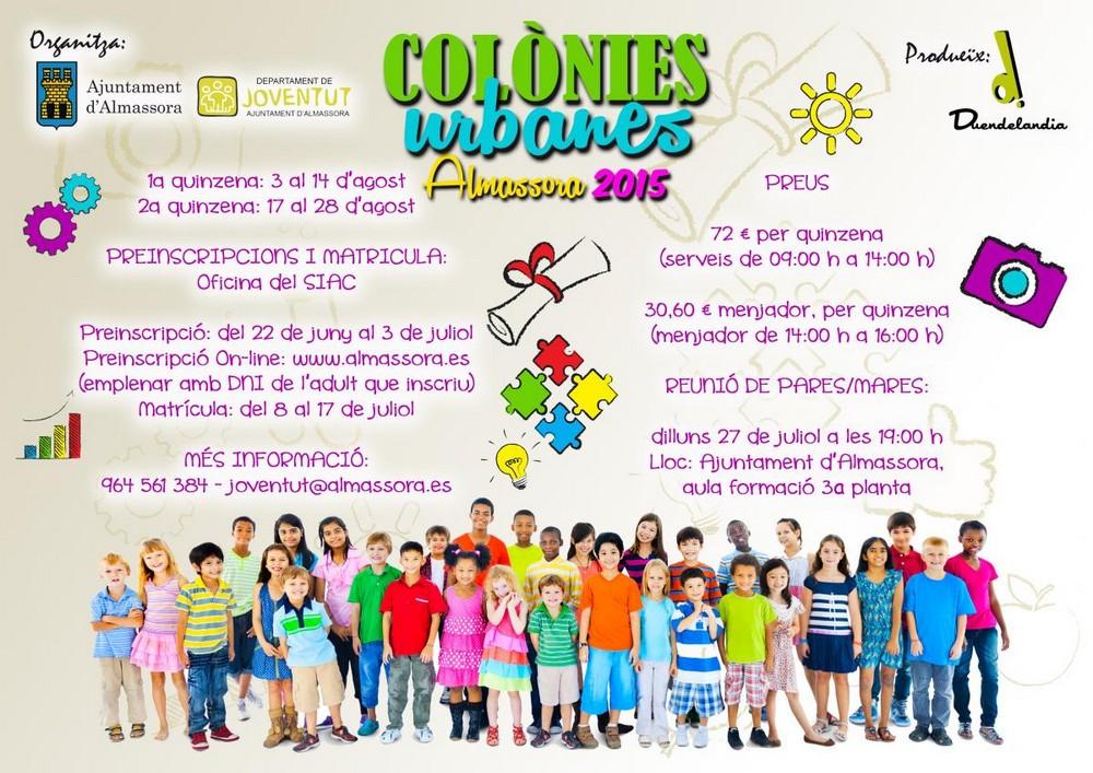 El Ayuntamiento de Almassora, a través de la concejalía de Juventud y en colaboración con el área de Servicios Sociales, ha abierto esta mañana, y hasta el 3 de julio, el periodo de preinscripción y matrícula de las Colonias Urbanas 2015, que tendrán lugar en las instalaciones del colegio Cardenal Cisneros en las quincenas del 3 al 14 de agosto y del 17 al 28 de agosto.