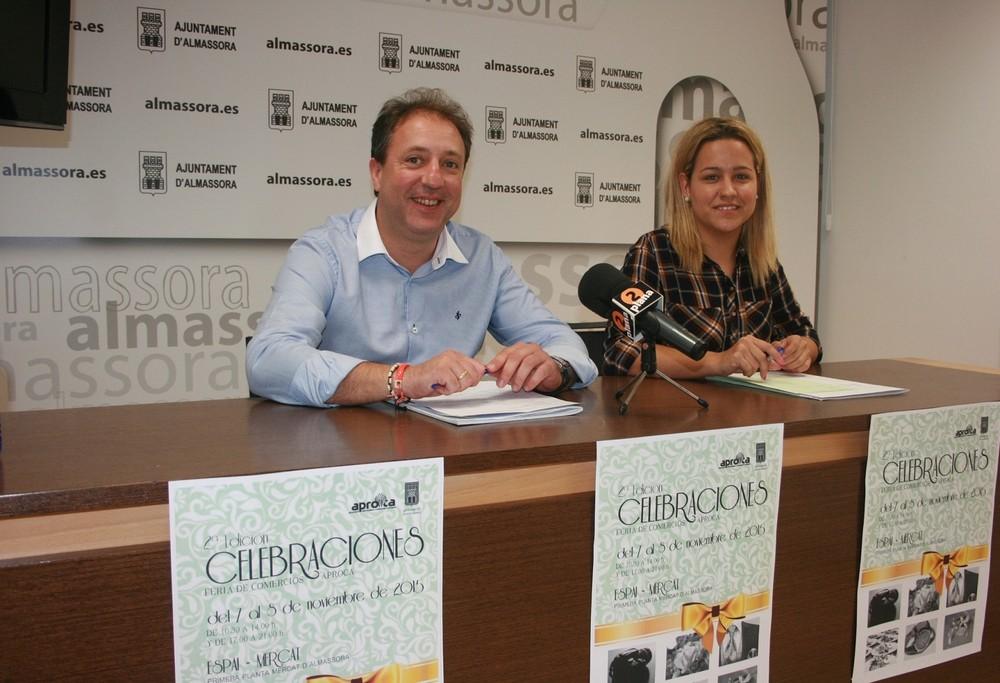 El concejal de Comercio, Santiago Agustí, y la presidenta de la plataforma de comerciantes y profesionales Aproca, Nerea López, han presentado esta mañana en Almassora la segunda edición de la feria Celebraciones. La muestra se llevará a cabo los próximos días 7 y 8 de noviembre en el Espai Mercat, ubicado en la primera planta del edificio del Mercado Central.