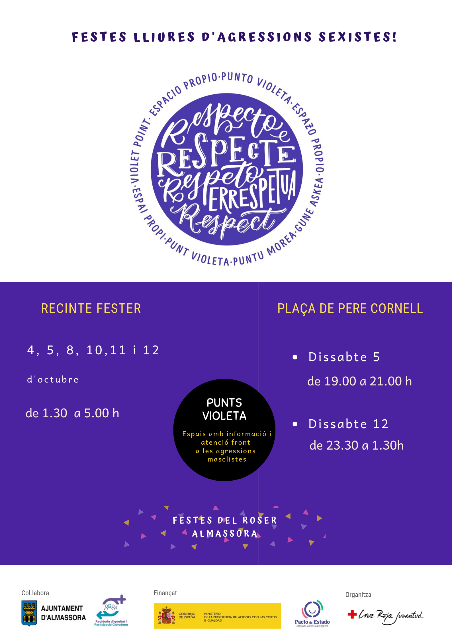 Per part seua, la plaça Pere Cornell obrirà els punts violeta el dissabte 5 de 19 a 21 hores i el dissabte 12 de 23.30 a 1.30 hores, de manera atenga el públic assistent als concerts programats en aquesta cèntrica ubicació. En qualsevol dels dos espais hi haurà personal de Creu Roja per a facilitar informació i atenció.