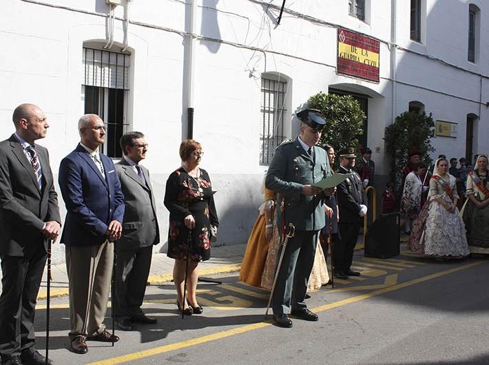 A continuación, la comitiva se han dirigido al cuartel de la Guardia Civil de Almassora, donde se ha leído una carta del Director General de la Guardia Civil. La alcaldesa de Almassora, Susanna Nicolau, ha entregado una medalla por su destacada hoja de servicios al oficial Ballesteros. Para finalizar, el primer alférez de la Guardia Civil de Almassora, Gregorio Prieto, ha destacado la buena relación de este cuerpo con la Policía Local y ha entregado a su intendente principal jefe, Roberto Verdoy, una placa conmemorativa.
