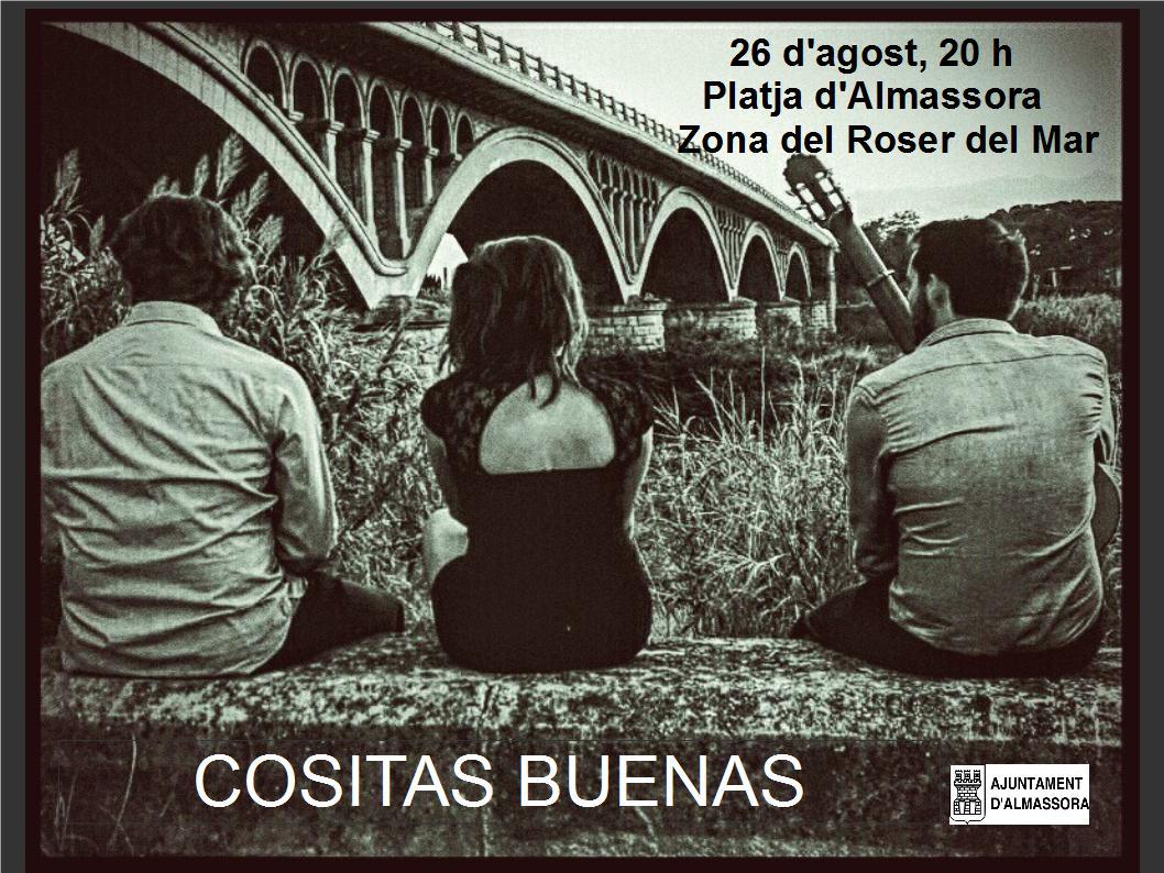 La actuación de Cositas Buenas es uno de los platos fuertes de la agenda, en la que han destacado eventos como la I Travessia Platja d'Almassora, la VII Volta a Peu Platges d'Almassora, la fiesta acuática Diverplatja o la recuperación de los torneos de voley playa organizados por la Associació de Penyes i Colles d'Almassora. En el terreno medioambiental, los talleres de construcción de refugios para murciélagos han despertado gran interés entre los vecinos y la campaña 'Almassora en acció' se ha trasladado durante el verano a la playa, donde el consistorio ha realizado talleres quincenales para toda la familia.