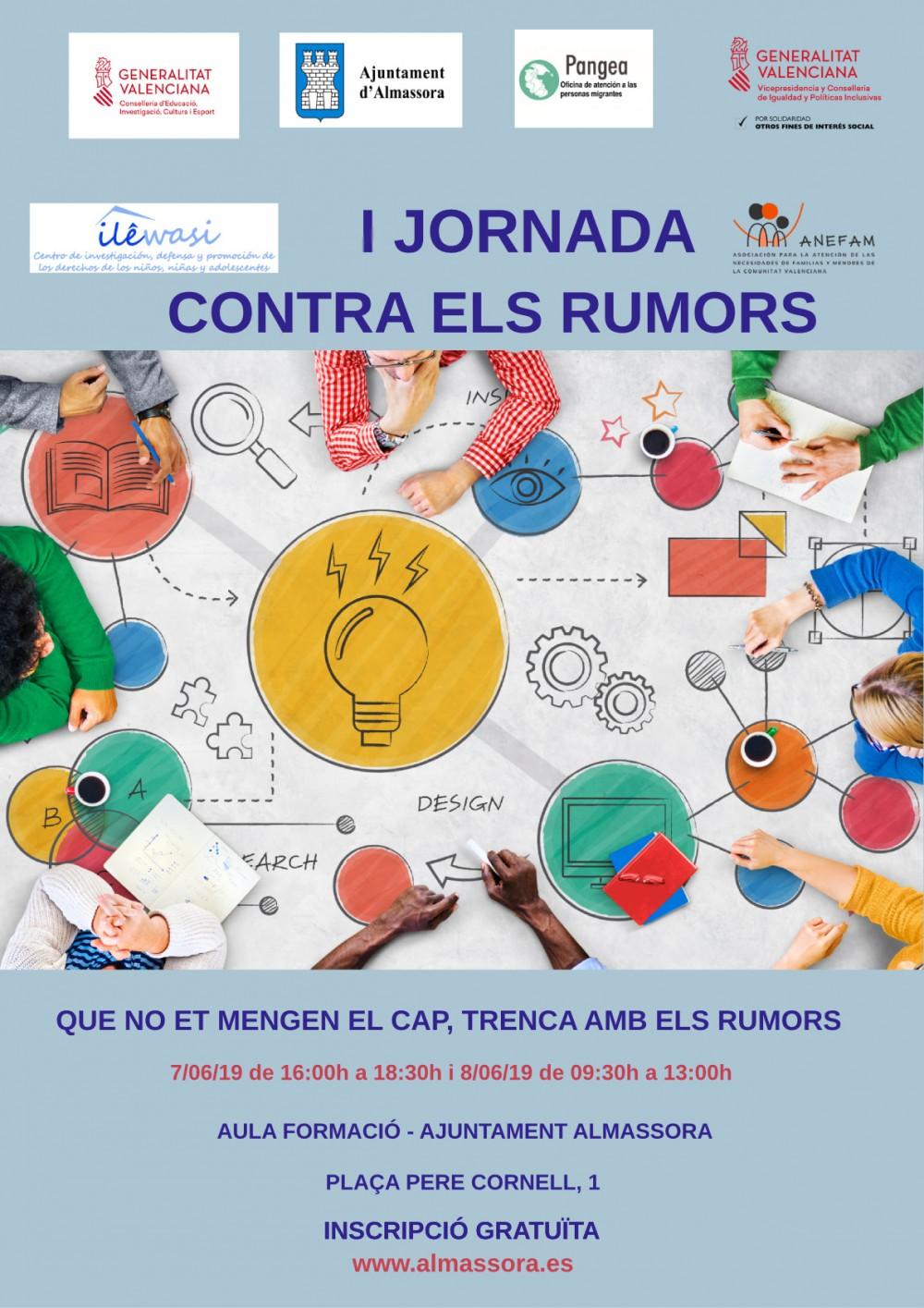 Almassora I Jornada contra els rumors (cartel)Per a l'edil “conéixer de prop a les persones amb la qual compartim espai i ciutat ajuda a millorar la convivència i ajuda estrényer llaços i al fet que ens ajudem mútuament”. Per això, la inscripció en aquestes jornades serà totalment gratuïta i està oberta a tota la població. No obstant això, la jornada resulta especialment interessant per a professionals de la docència o del treball social, així com per al personal voluntari d'associacions i entitats del municipi.
