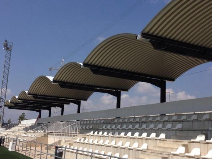 De hecho, la cubierta tiene una extensión de 60 metros lineales y dispone de canaletas para evacuar el agua de lluvia en caso de temporal. El alcalde, Vicente Casanova, y el regidor de Servicios Públicos, José Martínez, han visitado la instalación a fin de conocer los avances del proyecto que arrancó el pasado mes de julio con la instalación de la estructura sobre la que se soportan las piezas que ahora han empezado a cubrir las gradas.