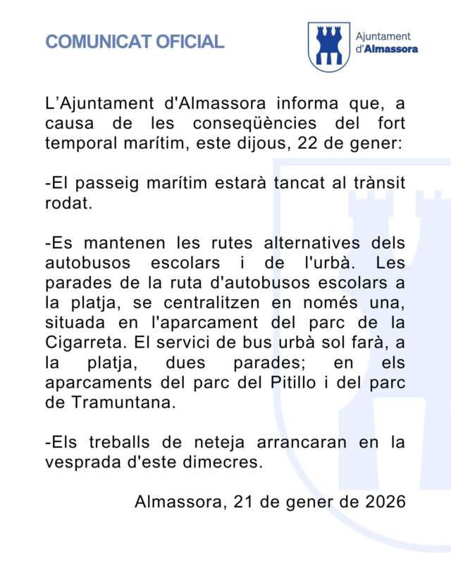 Així mateix, des de l'Ajuntament s'ha emés un comunicat oficial pel qual el passeig marítim romandrà tancat demà dijous 22 de gener.