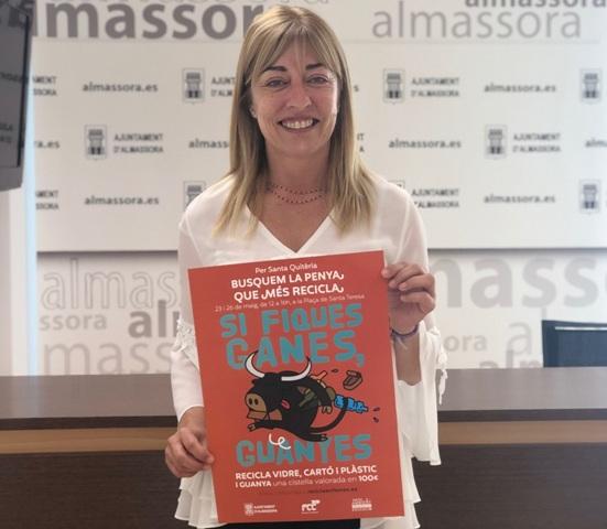La regidora de Medi Ambient d'Almassora, María José Tormo, ha presentat aquest matí la campanya 'Si fiques ganes, guanyes', que pretén implicar a les penyes en el reciclatge durant les festes de Santa Quitèria. La iniciativa abastarà enguany la recollida de vidre, paper i cartó i envasos de plàstic enfront del pesaje únic de vidre de la primera edició.