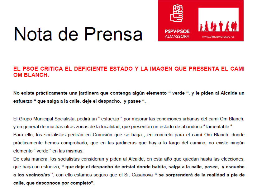 PP manda nota PSPV exige mejora Camí­ Om Blanc 240817El concejal del PP en Almassora, reivindicaba este mismo mes de agosto la necesidad de reponer bolardos en la playa, mientras Fernando Oliva, también concejal del Grupo Municipal del PP, transmitía a los dos ayuntamientos que había vecinos que se quejaban del estado de abandono de solares en la playa lo cual fomentaba la proliferación de plagas y basuras cerca de sus viviendas.