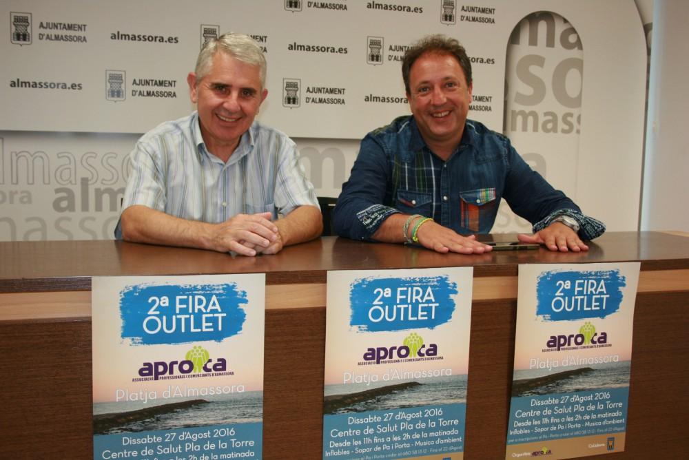 La playa de Almassora albergará este sábado su II Feria Outlet tras el éxito cosechado en la edición del pasado mes de julio. La iniciativa, una vez más, parte de la asociación Aproca y cuenta con la colaboración del Ayuntamiento de Almassora. El concejal de Comercio, Santiago Agustí, ha desvelado esta mañana las claves de la cita junto al presidente de la entidad, Javier Navarro, que ha destacado la buena acogida de la primera edición como clave para repetir la muestra.