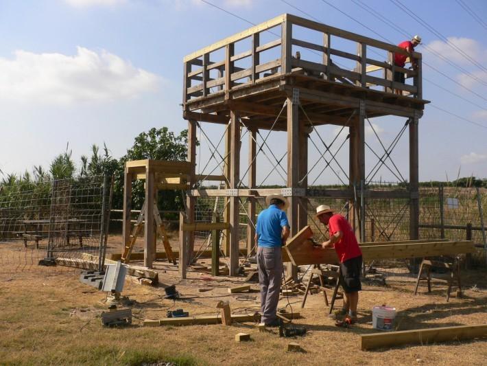 Los trabajos a realizar en la primera torre han incluido el desmontaje de la escalera y todos los elementos dañados, rehacer la escalera con pilares desde el suelo hasta la barandilla y fijar la escalera a la estructura principal. Además, la intervención supone reforzar con escuadras metálicas a los pilares de la barandilla y, ya en la estructura, reemplazar las tablas dañadas de la plataforma y pintar toda la estructura. Esta intervención tiene un coste de 7.139 euros.
