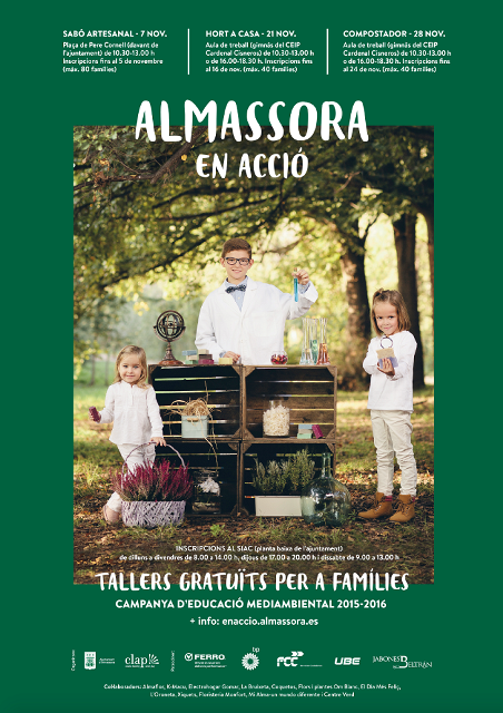 El Servicio de Información y Atención Ciudadana (SIAC) ha abierto hoy el plazo para inscribirse en los talleres de noviembre la campaña de Medio Ambiente “Almassora en acció”. Los cursos, que son gratuitos y están orientados a las familias, se dividen en: jabón artesanal, huerto en casa y compostador. Las inscripciones pueden formalizarse en la planta baja del Ayuntamiento de Almassora de lunes a viernes de 8.00 a 14.00 horas, además de los jueves en horario de 17.00 a 20.00 y los sábados entre las 9.00 y las 13.00 horas.