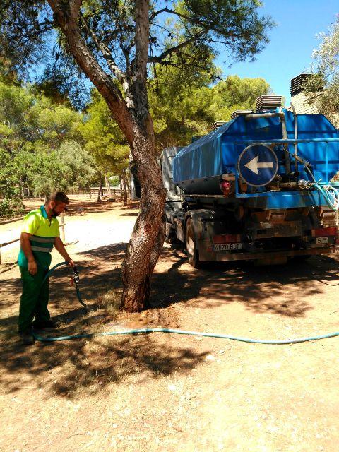 Els operaris del servei de jardineria de l'Ajuntament d'Almassora han regat en dues ocasions al mes de juliol els pins del passeig d'accés a Santa Quitèria, una operació que repetiran en tres ocasions durant el mes d'agost i de nou al setembre, en cas que no ploga prou.