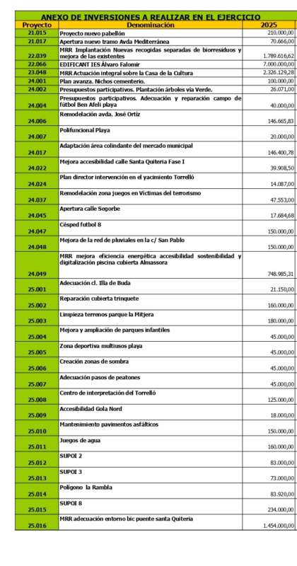 Els comptes de 2025, que tiren avant amb el vot a favor de l'equip de govern enfront de la negativa de PSPV i Compromís, contemplen quasi mig centenar d'importants actuacions i projectes tant en el nucli urbà com a la platja i els polígons industrials