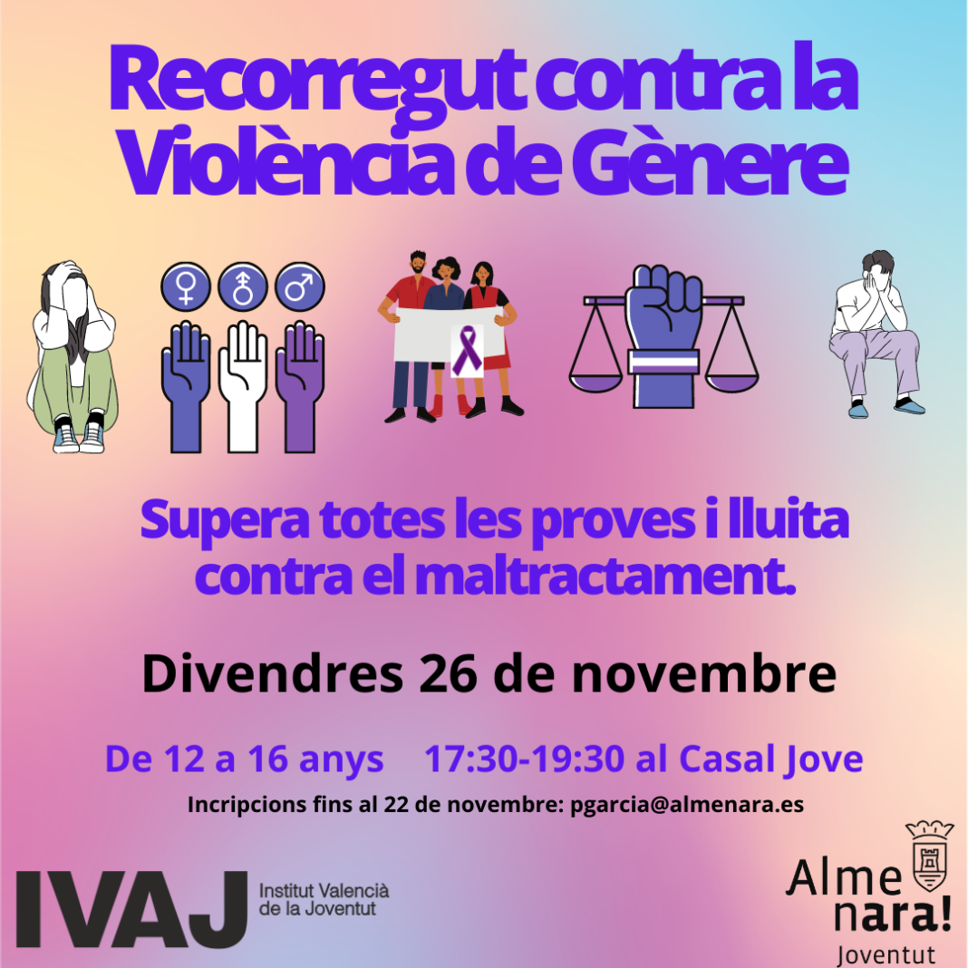 La concejalía de Juventud del Ayuntamiento de Almenara ha organizado dentro de la programación del 25-N para el viernes 26 de noviembre una yincana temática titulada "Recorregut contra la violencia de gènere" con el objetivo de concienciar contra la violencia machista superando diversas pruebas que se realizarán por equipos.