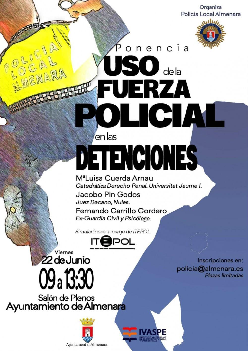 El Saló de Plens de l'Ajuntament d'Almenara acollirà el 22 de juny una ponència organizda des de la Policia Local d'Almenara en l'àmbit de la formació titulada 'Ús de la força policial en les detencions' que comptarà amb ponents de prestigi i especialitzats en la matèria com el cas del Jutge Degà de Nules, Jacobo Pin Godos, la catedràtica de Dret Penal de la Universitat Jaume I, Maria Luisa Cuerda Arnau, i Fernando Carrillo Conejero, ex- guàrdia civil i psicòleg que entre altres coses parlarà sobre les detencions sota estrès entre altres qüestions.