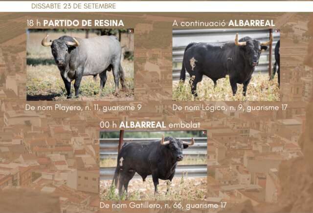 El primer exemplar patrocinat per l'Ajuntament d'Almenara s'exhibirà el dissabte 23 de setembre a les 18.00 hores serà un bou de la ramaderia de Partido de Resina de nom Playero, amb el número 11 i guarisme 9. A continuació s'exhibirà un altre bou de la ramaderia d'Albarreal, de nom Lógico, marcat amb el número 9 i el guarisme 17. De la mateixa ramaderia, Albarreal, serà el bou "cerril" que s'embolará a partir de les 12 de la nit. L'exemplar porta per nom Gatillero, número 66 i guarisme 17.