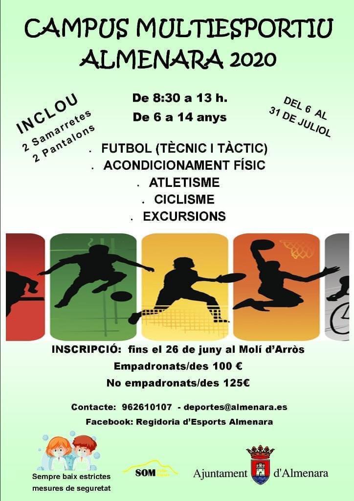 Del 6 al 31 de juliol l'Ajuntament d'Almenara posarà en marxa el Campus Multiesportiu dirigit a xics i xiques entre 6 i 14 anys d'edat i que es farà amb unes estrictes mesures de seguretat. Tindrà com a base l'ensenyament i la diversió en diverses disciplines esportives com són el futbol (tècnic i tàctic), el condicionament físic, l'atletisme, el ciclisme, jocs aquàtics o les excursions. El campus es desenvoluparà en horari matinal, entre les 8.30 i les 13 hores.