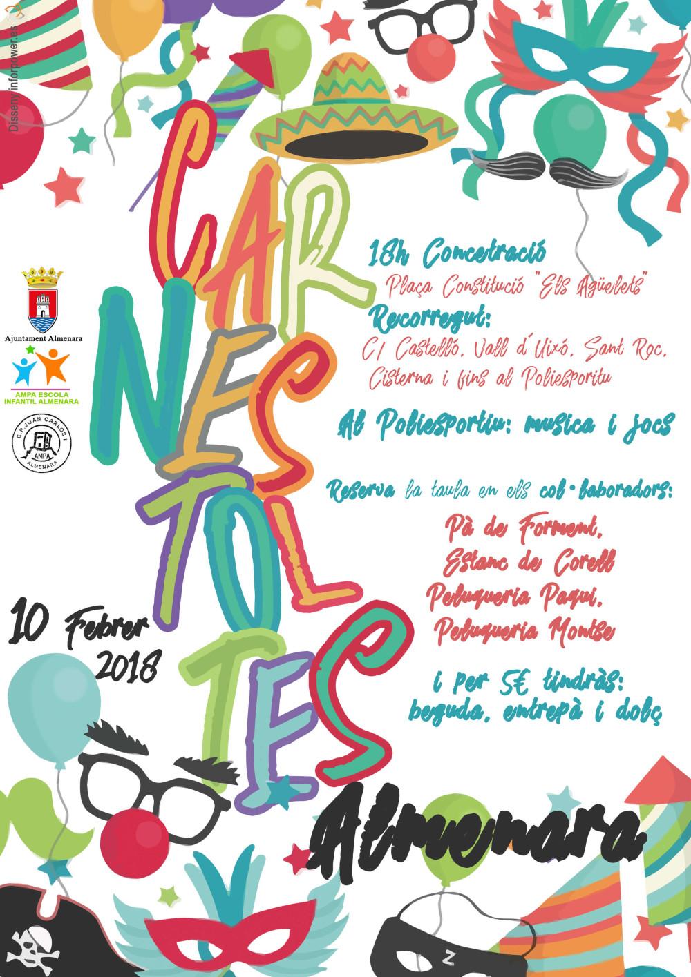 L'Ajuntament d'Almenara ja està ultimant tots els detalls per a la celebració el dissabte 10 de febrer del tradicional carnestoltes de la localitat, que enguany vindrà amb la gran novetat del canvi del recorregut de la desfilada, així com amb la consolidació de les activitats de jocs, música i sopar en el poliesportiu cobert de la localitat. El carnestoltes es realitzarà amb la col·laboració de les Associacions de Mares i Pares d'Alumnes tant de l'Escola Infantil Municipal com també del CEIP Juan Carlos I.