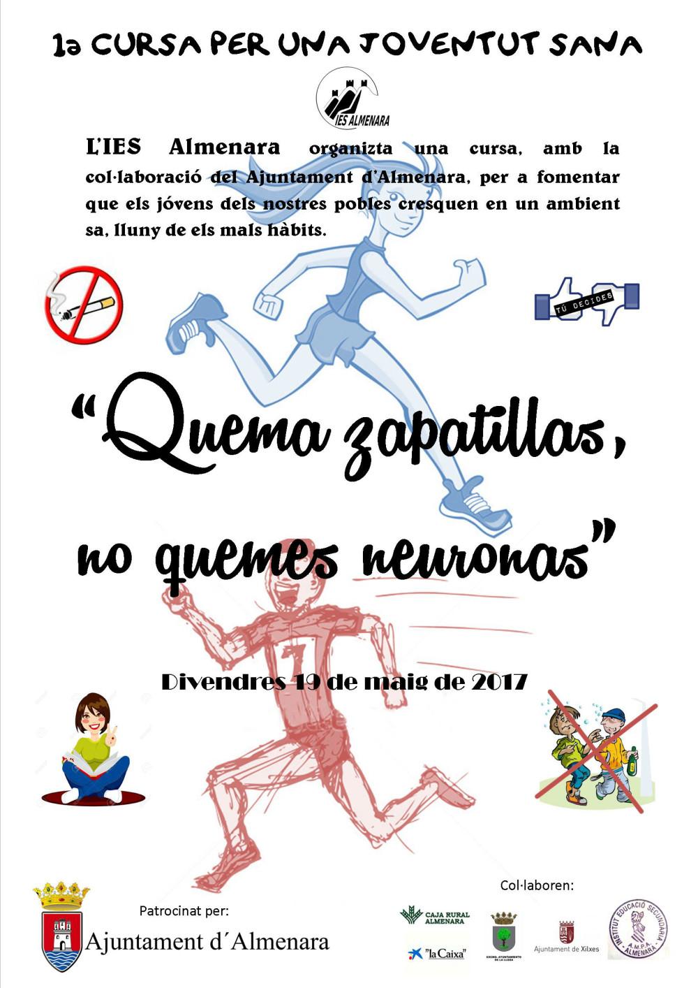 El municipio de Almenara se volcará el próximo viernes contra la droga con una carrera que llevará por lema “Quema zapatillas, no quemes neuronas” y que culminará la campaña contra la drogadicción realizada desde el IES Almenara así como también la Setmana de la Ciència “Ramón Lapiedra”. En la iniciativa los ayuntamientos de Almenara, la Llosa y Xilxes también colaboran y es más, participarán alumnos de los colegios de las tres localidades.