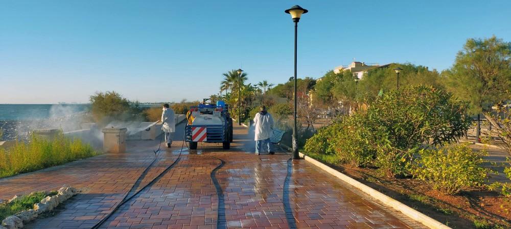 El Ayuntamiento de Almenara continúa con las tareas de desinfección tanto del núcleo urbano de la localidad como de la Playa Casablanca a través de la Brigada Municipal de Obras y Servicios, así como de los voluntarios de Protección Civil. El concejal de Obras y Servicios, Lorenzo Vicent, ha destacado que "seguimos de manera permanente con la labor de las desinfecciones de nuestras calles y espacios, así la semana pasada se actuó en las calles del núcleo urbano de Almenara y esta lo hemos hecho en la Playa Casablanca". El concejal ha señalado que "seguiremos con las desinfecciones en nuestras calles".