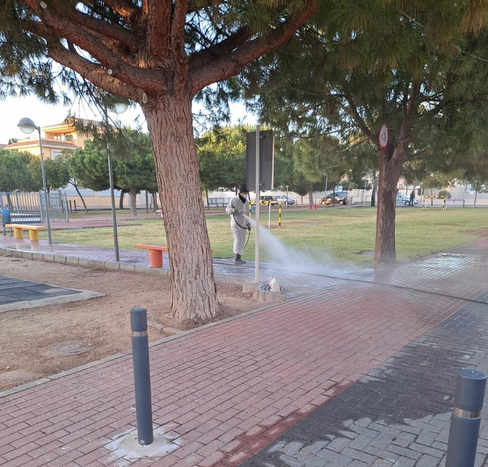 L'Ajuntament d'Almenara mitjançant la Brigada Municipal i Protecció Civil continua amb la desinfecció tant del nucli urbà com marítim de la localitat, així com dels espais més freqüentats pels veïns. De fet, les tasques s'han intensificat amb les actuacions realitzades aquest matí en diversos espais públics, tal com ha destacat el regidor d'Obres i Serveis, Lorenzo Vicent.