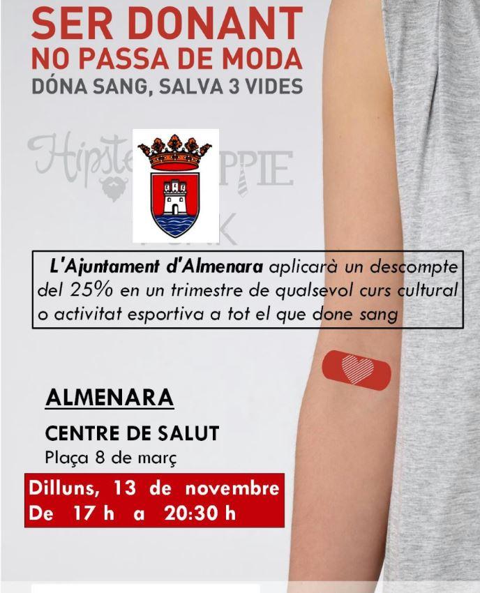 El Ayuntamiento de Almenara quiere fomentar la donación de sangre en la localidad por lo que ya ha comenzado a realizar un llamamiento a todas las personas interesadas para que acudan a la donación programada dentro de un mes, el 13 de noviembre, en el Centro de Salud de la localidad, entre las cinco y las ocho de la tarde.