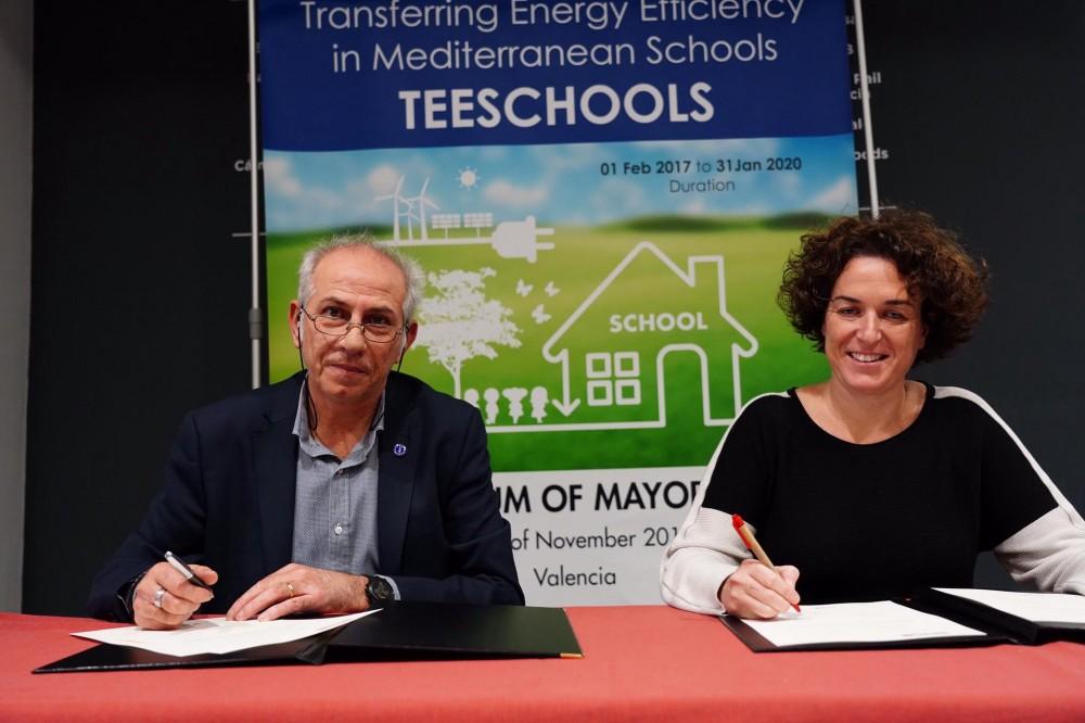 Una de las apuestas de las obras del Pla Edificant en el CEIP Juan Carlos I de Almenara es la eficiencia energética, tanto en la actuación ya realizada como en la que se va a realizar próximamente, que ya está adjudicada. Esta apuesta ha llevado a que la alcaldesa de Almenara, Estíbaliz Pérez, y el secretario general de la Federación Valenciana de Municipios y Provincias hayan firmado esta mañana un memorándum para trabajar y fomentar las recomendaciones del proyecto TEESCHOOLS, dentro de la estrategia de eficiencia energética en el colegio del municipio. Almenara es el único municipio de Castelló participante en la jornada y firmante del memorándum.