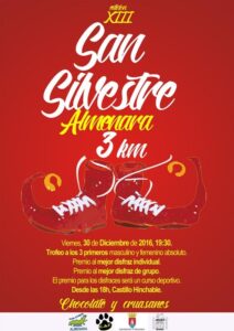 A més demà divendres a les 19:00 hores arribarà la XIII edició de la Sant Silvestre d'Almenara, encara que des de les 18 començarà la festa amb música i inflables. També hi haurà xocolatà per als assistents. La prova tindrà trofeus per als tres primers i les tres primeres que arriben a la meta, així com hi haurà un premi d'un curs esportiu per als premiats de la millor disfressa individual i la millor disfressa col·lectiva.