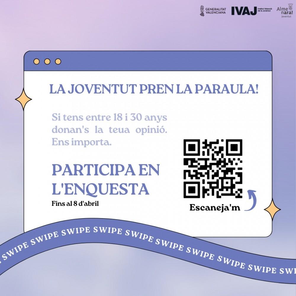 La joventut d'Almenara prendrà la paraula a través d'una sèrie d'enquestes per a dissenyar el futur Pla Jove de la localitat, en una acció coordinada des de la Regidoria de Joventut d'Almenara amb la col·laboració de 'Xarxajove' i de l'Institut Valencià de la Joventut (IVAJ) de la Generalitat Valenciana. Les enquestes, que podran completar les i els joves de 18 a 30 anys fins al 8 d'abril, es realitzaran en línia a través d'un codi qr que es podrà trobar en les xarxes socials municipals i en l'Instagram de la Regidoria de Joventut (@regidoria_joventut_almenara).