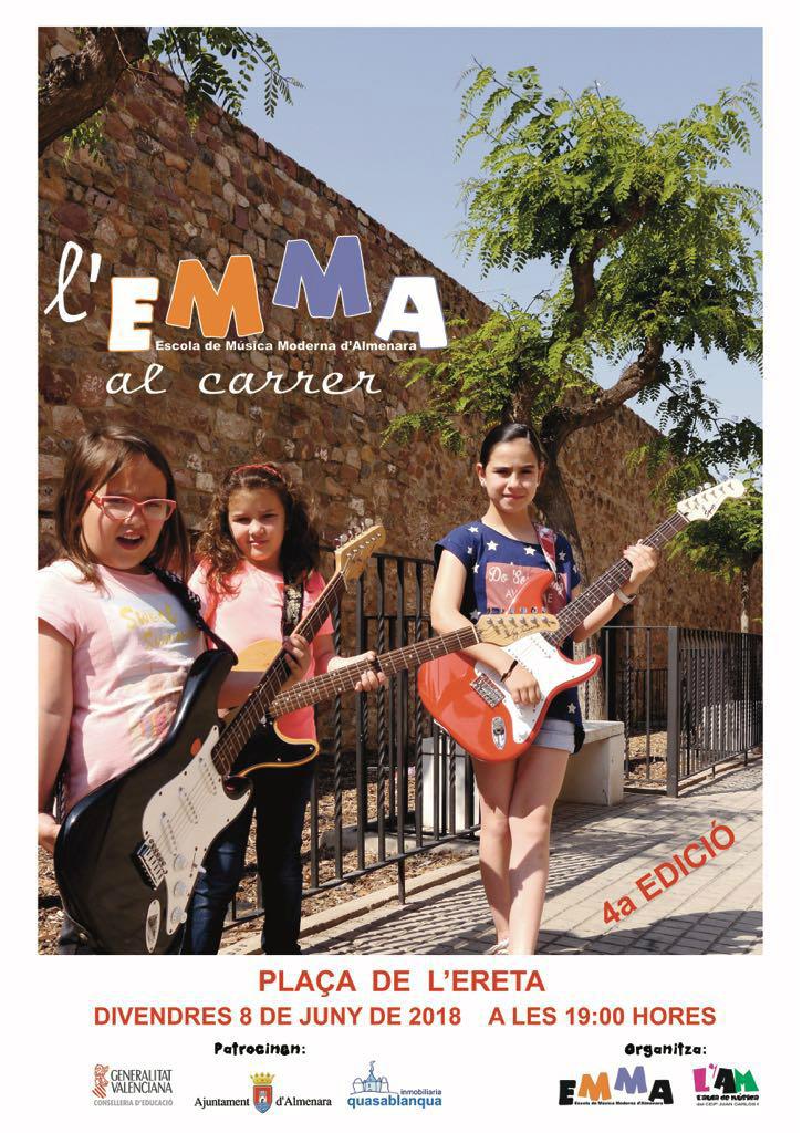 EMMA AL CARRERLa Plaça de l'Ereta acollirà el divendres 8 de juny un any més 'l'EMMA al carrer' on es mostraran a manera de fi de curs les habilitats de l'alumnat de l'Escola de Música Moderna d'Almenara (EMMA) on els alumnes interpretaran temes de jazz, soul, hip-hop o punk. L'EMMA és una iniciativa pionera i que va sorgir de l'Estany's Band amb l'objectiu de donar continuïtat a l'aprenentatge musical. L'Escola de Música Moderna d'Almenara està vinculada al CEIP Juan Carlos I de la localitat, al que pertany, formant part des del curs 2012-2013 comptant amb el suport i reconeixement de la Conselleria d'Educació a través dels programes d'innovació, igual que de l'Ajuntament d'Almenara que també ofereix suport econòmic i institucional, juntament amb iniciatives privades com Quasiblanca.