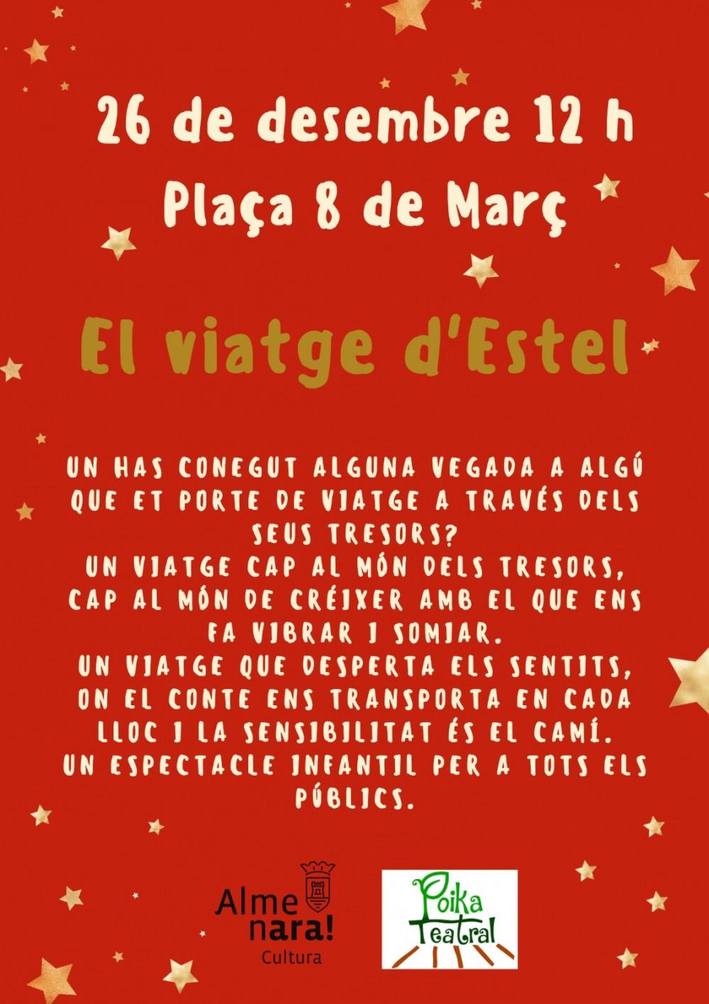 Així doncs, el diumenge 26 de desembre, en la Plaça 8 de Març, arribarà la representació de 'El Viatge d'Estel' per a públic familiar a càrrec de Poika Teatre. D'altra banda es manté, sota reserva prèvia, la visita guiada a la línia XYZ prevista per al dia 29 a les 10 del matí amb eixida en la Plaça de la Constitució (Agüelets).