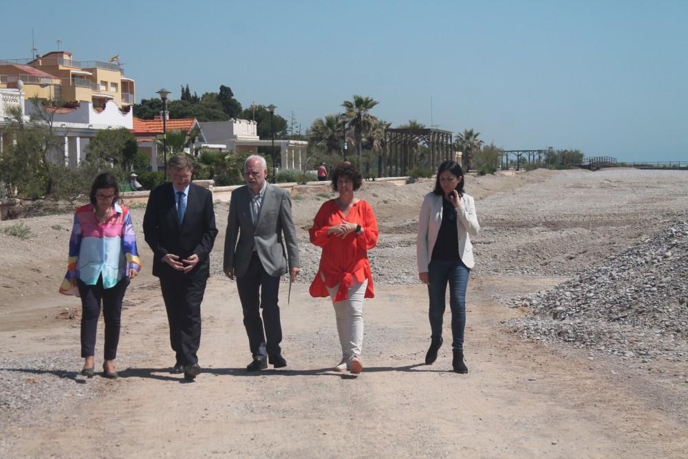 Las obras de la construcción de los espigones y regeneración de la Playa Casablanca de Almenara estarán terminadas a principios del mes de julio. Así lo ha comunicado esta mañana la alcaldesa, Estíbaliz Pérez, durante la visita que ha realizado el president de la Generalitat a las actuaciones, junto a la subdelegada del Gobierno, Soledad Ten y Eva Redondo, directora territorial de Presidència en Castelló.