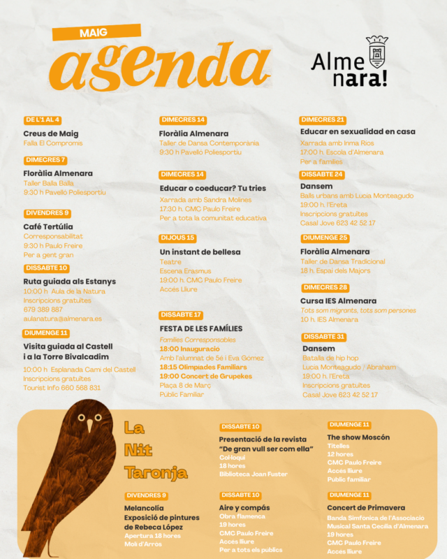 Almenara presenta una agenda cultural plena d’activitats, pel mes de maig. Algunes de les activitats són: el VIII Festival Cultural d'Almenara (La Nit Taronja), la Festa de les Famílies, les danses i balls de Floràlia i Dansem, el teatre d'Escena Erasmus, les xarrades de coeducació, les visites guiades als Estanys i al Castell, i la carrera de l'IES.