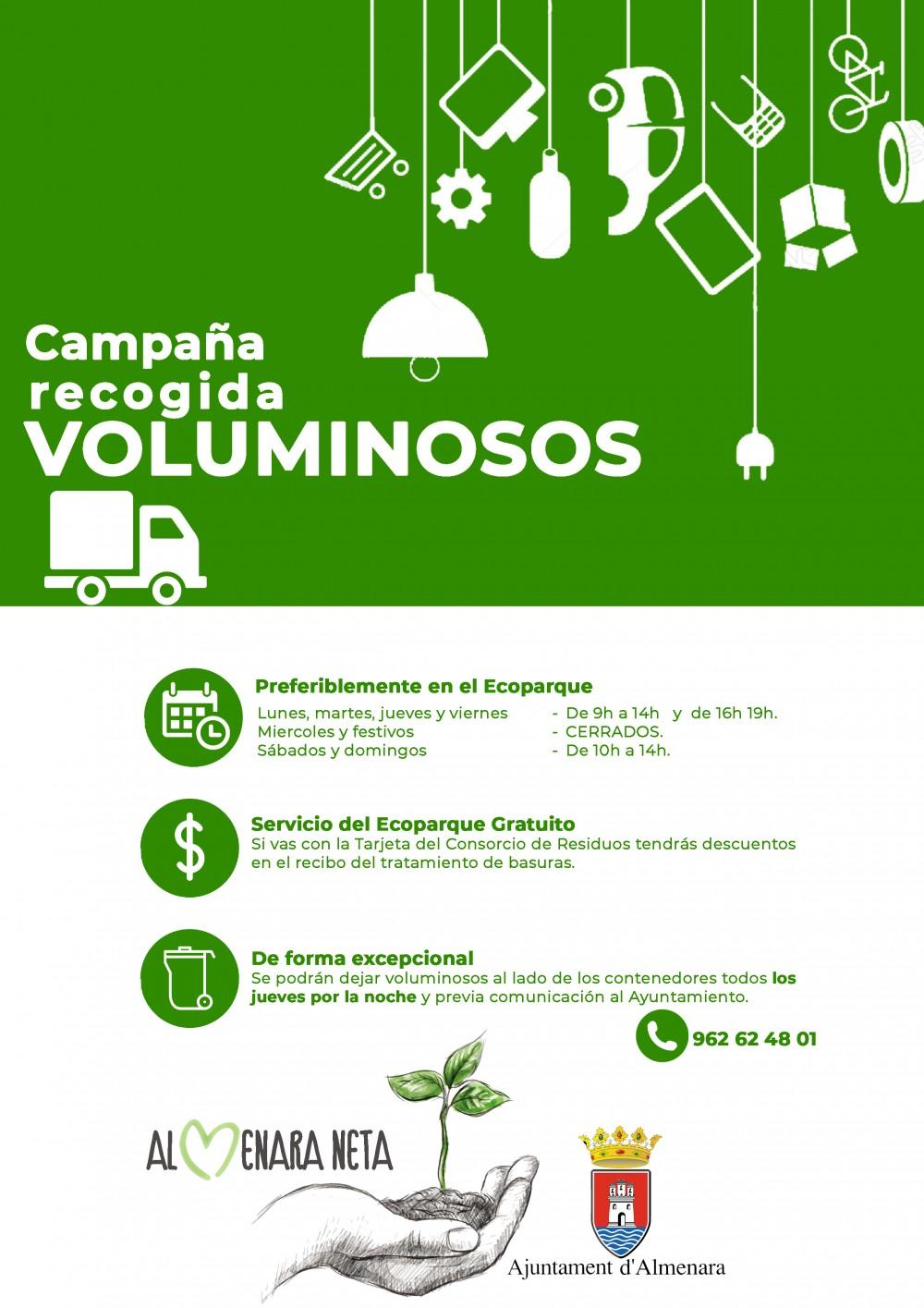 L'Ajuntament d'Almenara ha iniciat una campanya informativa destinada a la conscienciació dels veïns i veïnes perquè depositen els residus voluminosos en els llocs i dies correctes, recordant les opcions tant de l'ecoparc com de recollida per part del consistori, aprofitant aquestes dates estiuenques on se sol fer neteja en els domicilis. La campanya es realitzarà tant en xarxes socials, com a través de cartelleria i tríptics informatius.