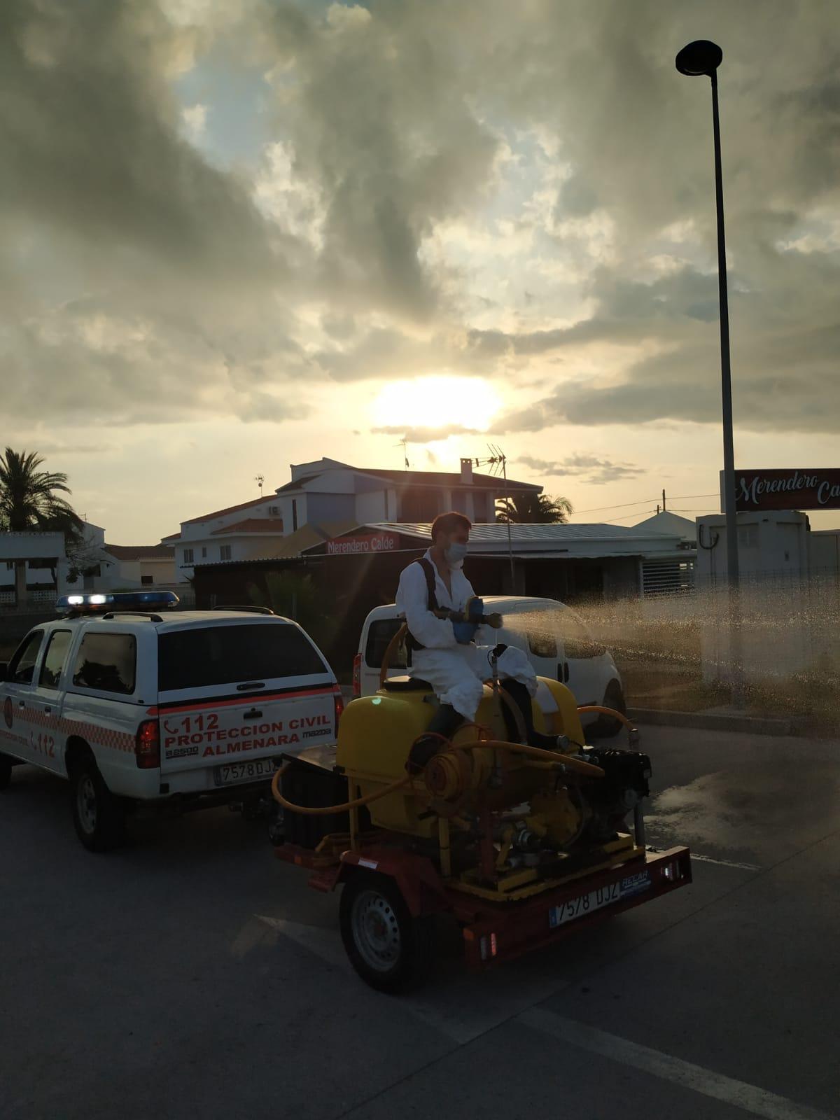 El Ayuntamiento de Almenara ha intensificado las tareas de desinfección en la localidad a lo largo de los últimos días. Así, desde Protección Civil se ha realizado una desinfección general de las calles, mobiliario urbano y espacios de la Playa Casablanca durante los últimos días, tarea que a partir de mañana comenzará a realizarse de nuevo en el núcleo urbano del municipio. Además desde la Brigada Municipal de Obras y Servicios se ha incrementado la frecuencia de la limpieza y desinfección de los contenedores del municipio. Al mismo tiempo los parques infantiles se desinfectan a diario, de lunes a domingo.