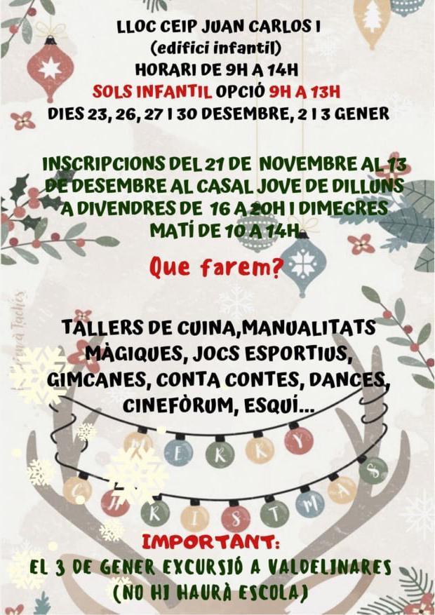A més de l'excursió a Valdelinares en l’Escola de Nadal   s'oferirà una variada i lúdica programació on podran gaudir d'un fum d'activitats nadalenques aprenent i jugant d'una forma diferent i divertida adaptada per als diversos sectors d'edats. Així hi haurà tallers audiovisuals, de manualitats màgiques i de cuina. Al llarg de la programació tampoc faltarà l'esport i les gimcanes. No faltarà tampoc la música, el ball i les danses.
