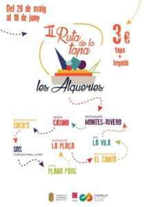 Les Alqueries celebrará la segunda edición de la Ruta de la Tapa desde el día 29 de mayo hasta el 18 de junio con un total de ocho establecimientos participantes, dos más que en la edición anterior. La mecánica se mantendrá igual y los asistentes deberán votar por la mejor tapa. Como novedad, la Ruta de la Tapa de les Alqueries es la primera en repartir 12.000 posavasos en los locales participantes con el objetivo de concienciar y sensibilizar a la población respecto a la violencia de género. “La ruta funcionó muy bien el año pasado, por lo que en esta edición se ha aumentado la duración de la ruta, pasando de 2 a 3 semanas” indica la concejala de comercio, Laura Maure y añade que “espera que esta iniciativa sirva para promocionar la ciudad, su hostelería y comercio”