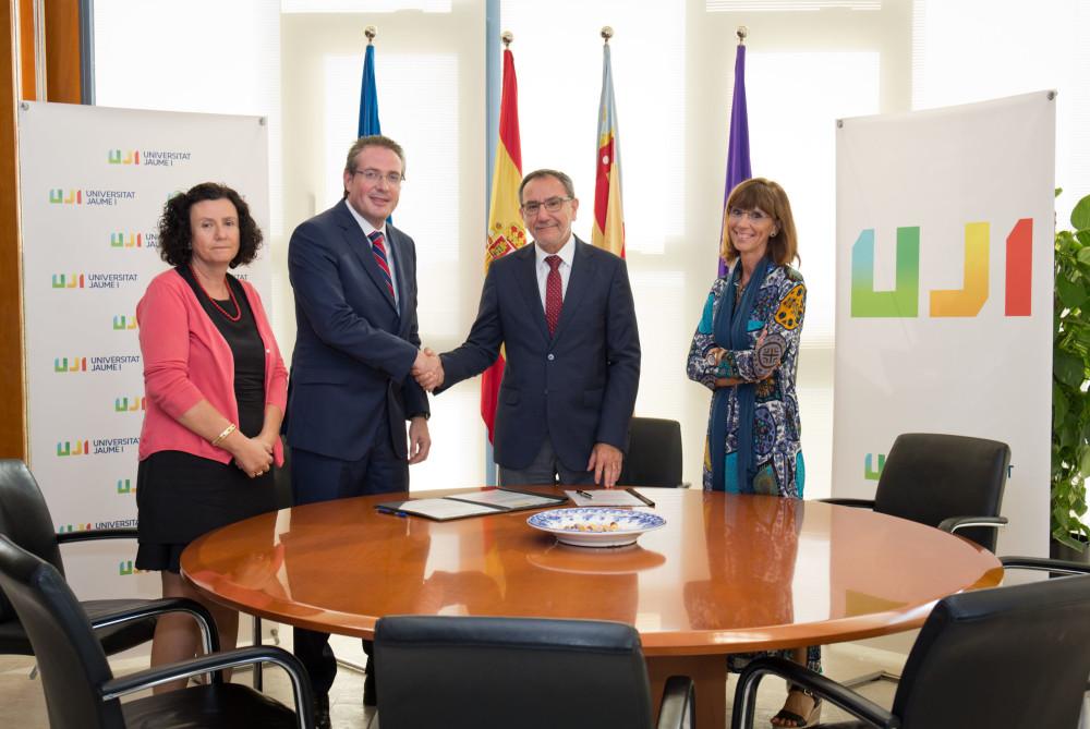 En el acto de entrega del convenio, han estado presentes el rector de la UJI, Vicent Climent; el subdelegado del Gobierno en Castellón, David Barelles, y la vicerrectora de Estudiantes, Empleo e Innovación Educativa, Pilar García Agustín.