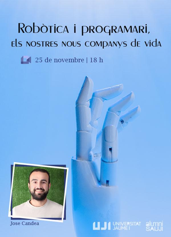El programa d'antic alumnat de la Universitat Jaume I, AlumniSAUJI, ha organitzat el dia 25 de novembre a les 18 hores, a través de la plataforma Google Meet, la xarrada en línia «Robòtica i programari, els nostres nous companys de vida. Com ens ajuden les noves tecnologies al nostre dia a dia?», on l'antic alumne en Tecnologies Industrials de l'UJI José Candea, contextualitzarà el paper de la robòtica i del programari en la societat actual, quin lloc ocupa i cap on avança en àmbits domèstics i laborals des d'una perspectiva senzilla i familiar.