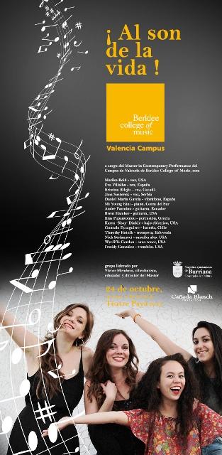 Posteriormente en el teatro Payà y bajo la dirección del prestigioso compositor y profesor en el campus de Berklee en Valencia, Victor Mendoza, ofrecerán un concierto titulado “Al son de la vida”. Cantantes e instrumentistas de varias partes del mundo interpretarán temas cantados en español y que reflejan sentimientos comunes a las culturas latinas de España y América. Como parte del repertorio se interpretarán temas de Chico Navarro, Violeta Parra o Fito Páez.