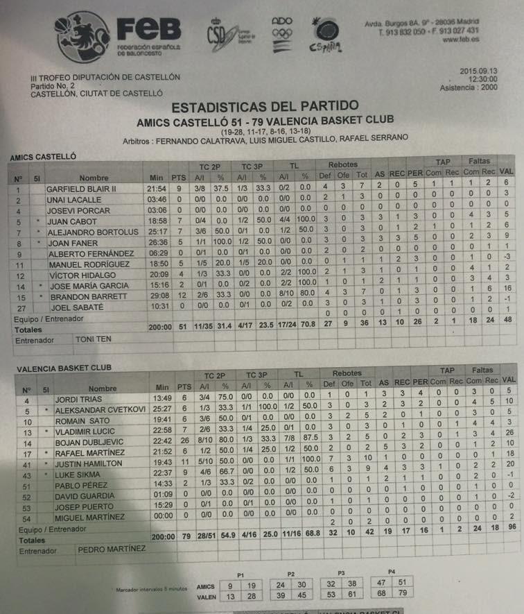Las estadísticas del partido entre Amics Castelló y Valencia Básquet.