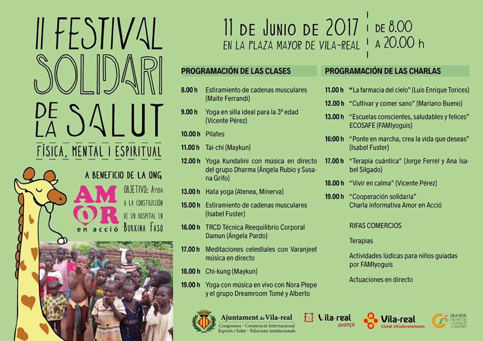Amb la col·laboració de l’Ajuntament de Vila-real i les Regidories de Proximitat i Esport es celebrarà aquest diumenge 11 de juny en la plaça major el II Festival de salut física, mental i espiritual, “un acte en el qual la premissa és donar i rebre per totes les parts implicades”, assenyala la coordinadora d’esdeveniments d'Amor en Acció, Ana Claramonte. Durant dotze hores i sense descans, de 8.00 a 20.00 la plaça Major de Vila-real albergarà tot tipus d’activitats, des de Ioga, tai-txí, estiraments, meditacions a xarrades i un mercat solidari i sorteigs per a recol·lectar diners que “aniran directament per la construcció d'un hospital al país africà”, explica Claramonte.