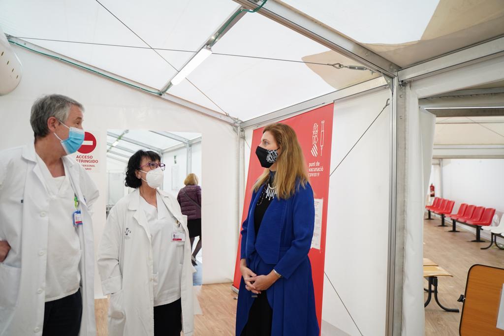 La alcaldesa de Castelló, Amparo Marco, ha visitado esta mañana las instalaciones del hospital de campaña levantado junto al Hospital General Universitario.