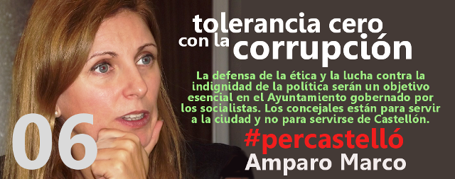 La candidata a las primarias socialistas de Castellón, Amparo Marco, propugna la “tolerancia cero” con la corrupción. “La defensa de la ética y la lucha contra la indignidad de la política serán un objetivo esencial en un Ayuntamiento gobernado por los socialistas. Los concejales y las concejalas están para servir a Castellón y no para servirse de la ciudad”, indica.