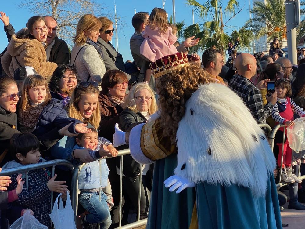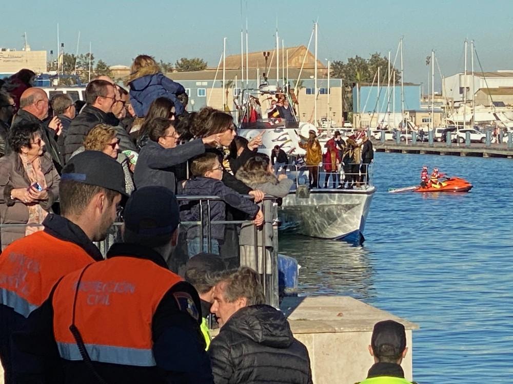 La llegada de la embarcación de sus Majestades llegaba acompañada de multitud de barcos de recreo adornados que pitaban en señal de saludo a los Magos de Oriente.