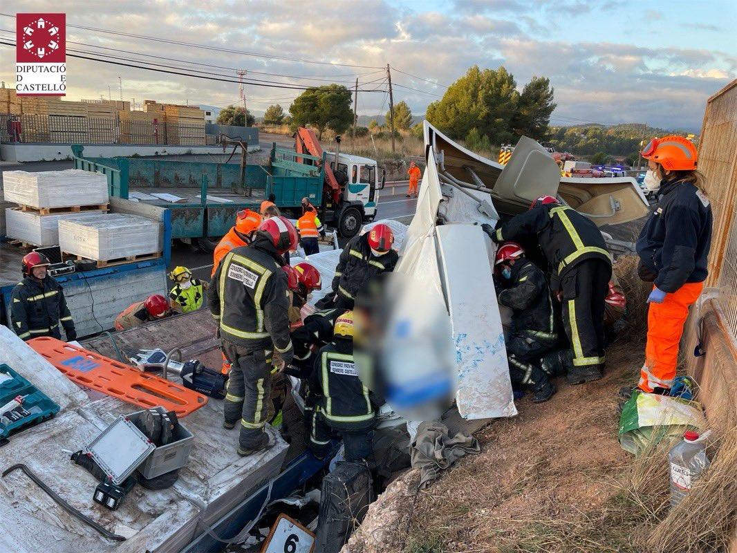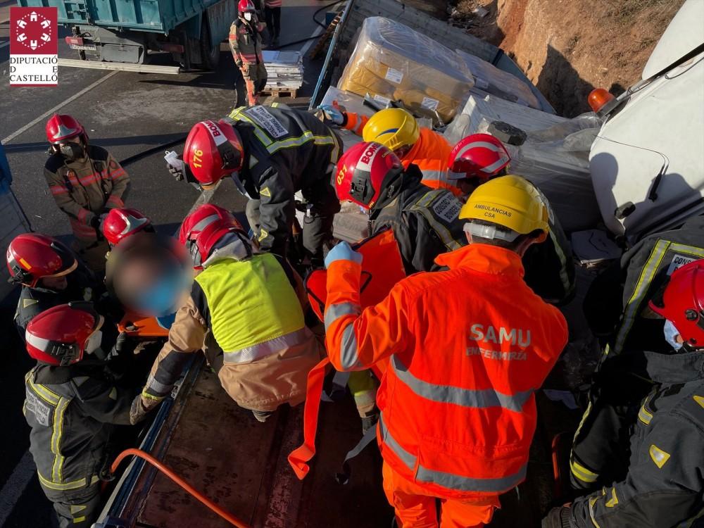 Todo ha ocurrido cuando un camión ha sufrido una salida de vía, quedando la cabeza tractora separada del remolque e incrustada entre el terraplén y el remolque. El conductor había quedado totalmente atrapado como consecuencia del accidente, lo que ha dificultado enormemente las tareas de excarcelación.