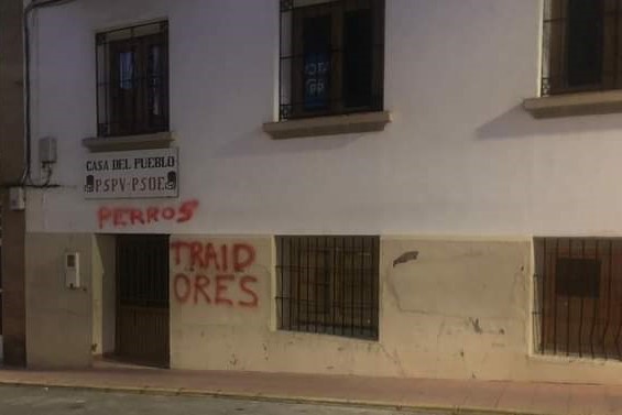 La fachada ha sido vandalizada con grafitis en los que se pueden leer las palabras 'Perros' y 'Traidores'